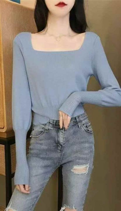春秋新款薄款法式方领洋气弹力修身显瘦包芯纱套头毛衣,独立包装,均码面料...