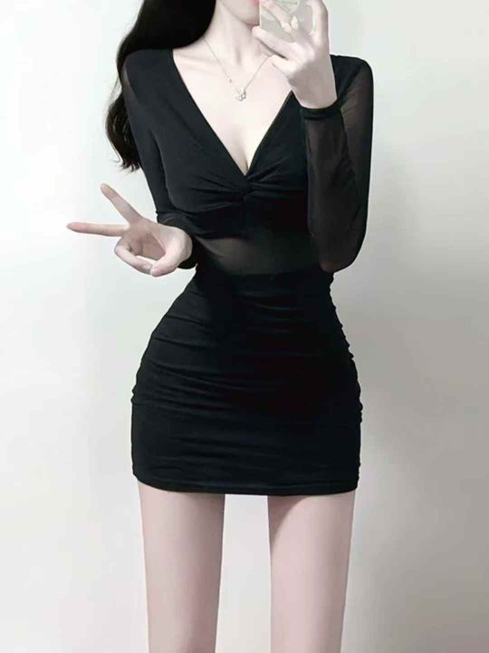 纯欲风性感V领连衣裙女秋冬季甜辣妹设计感内搭网纱修身包臀短裙,单款单色,1到4码,350件左右,4.5清,分货加1