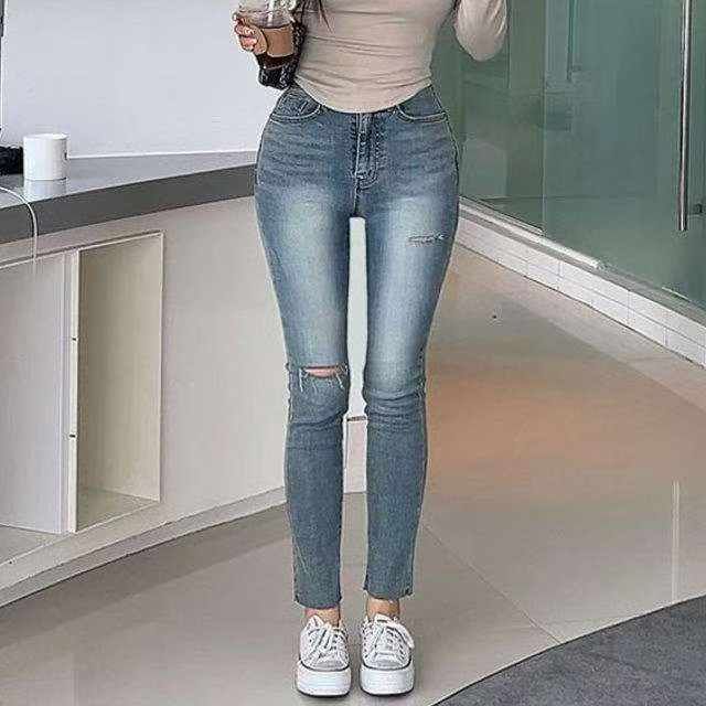 春秋新款破洞设计款高弹力老爹哈伦牛仔裤,独立包装带...