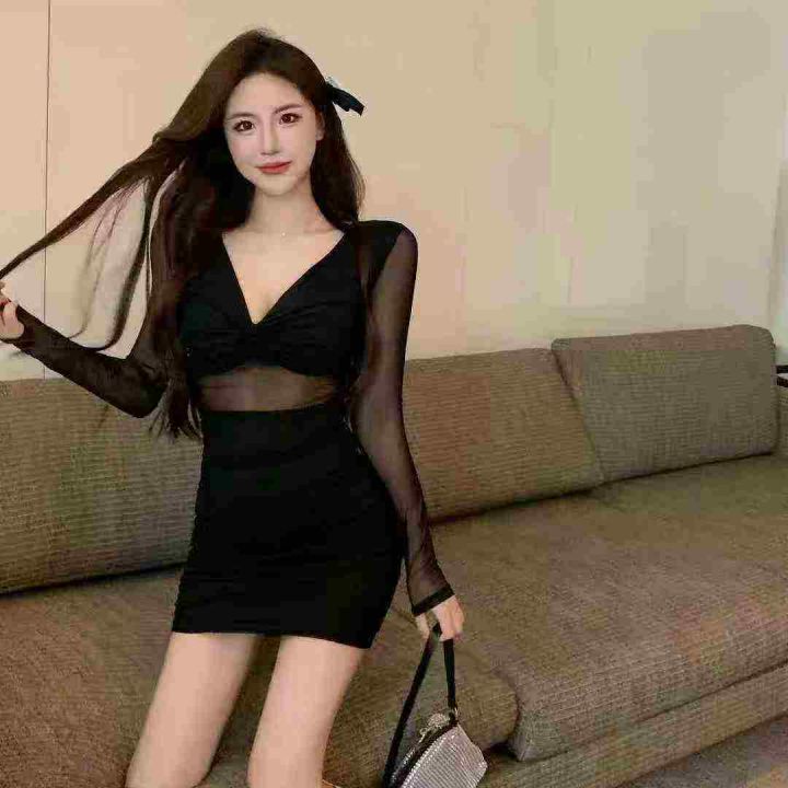 纯欲风性感V领连衣裙女秋冬季甜辣妹设计感内搭网纱修身包臀短裙,单款单色,1到4码,350件左右,4.5清,分货加1
