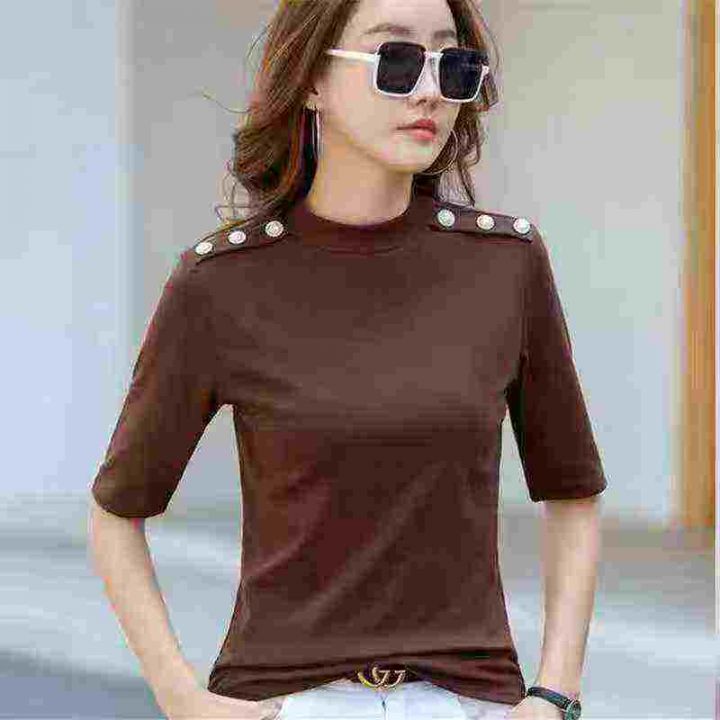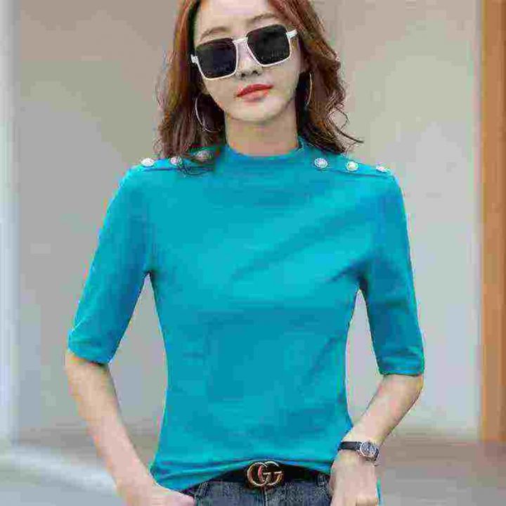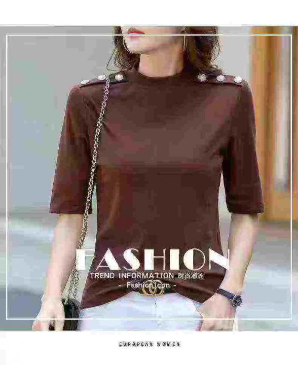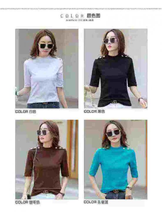1300件五分袖t恤女修身欧洲站女装2025春新款洋气半高领纯棉显瘦打底衫,整款4个颜色,独立包装带吊牌,码数S一3XL,全清10.8分货加1