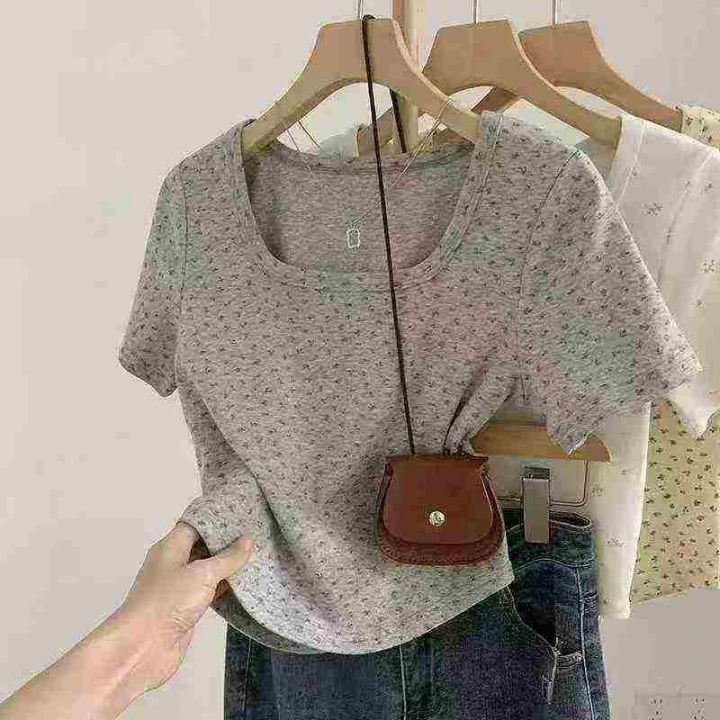 全清5.9韩系碎花正肩圆领短袖t恤女早春季修身内搭叠温...