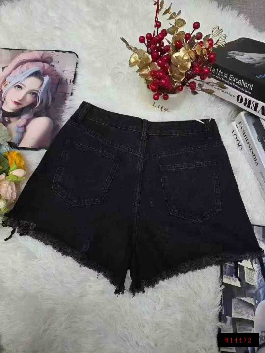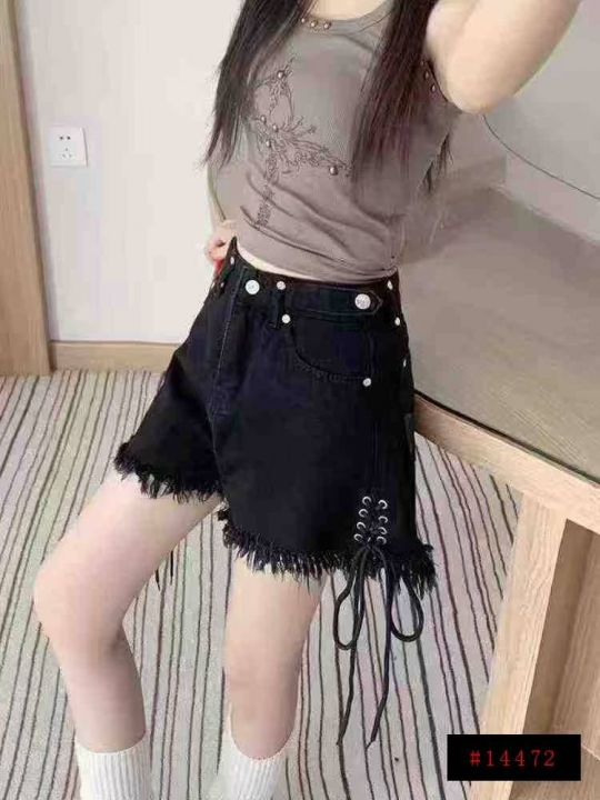3️⃣美式甜辣风黑色牛仔短裤女夏季设计感毛边绑带a字...