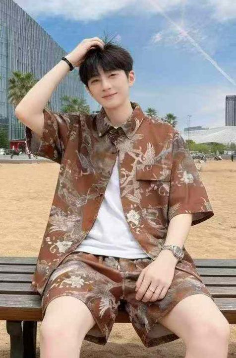 夏季新款男女同款碎花衬衫短裤沙滩海边两件套,独立包装,工厂新货1--4码(...