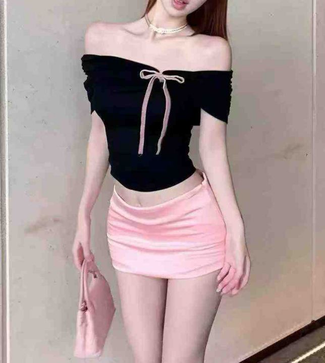 甜欲棉质辣妹一字领上衣599件7.8面料柔软有弹力,绑带蝴蝶结,褶皱设计,码...