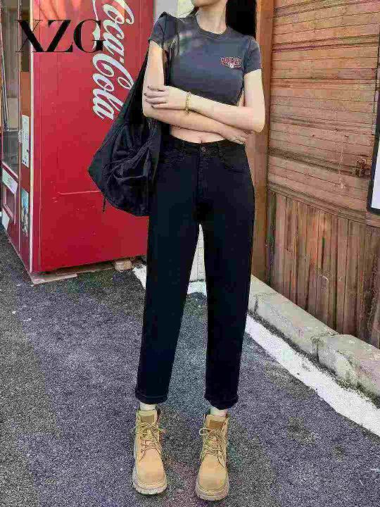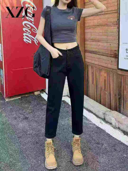 黑色哈伦高腰显瘦小脚抓绒老爹弹力牛仔裤,单款单色,...