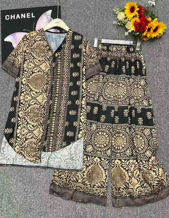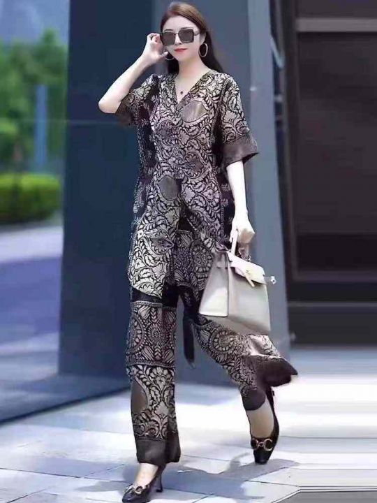 夏季新款冰丝顺滑气质时尚轻奢印花中长款宽松衬衫+高腰直筒裤两件套,独立包装,码数S--2XL码, 840套左右,全清8.9元超低价秒杀!分货加一!