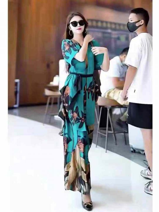 夏季新款冰丝顺滑气质时尚轻奢印花中长款宽松衬衫+高...