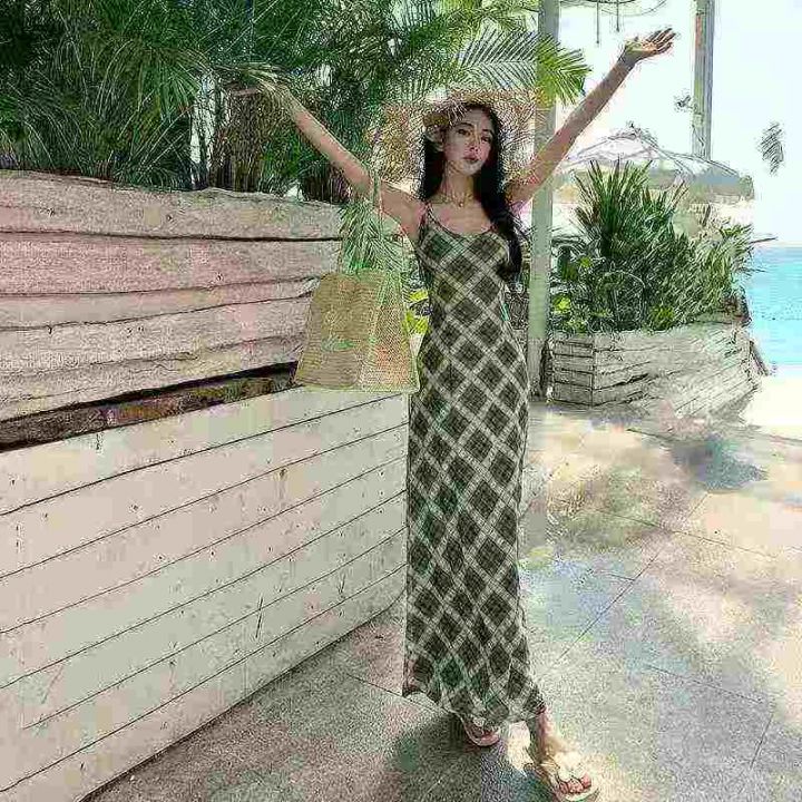 法式复古吊带连衣裙105件8.9,绿色格纹,码数1-4码(S...