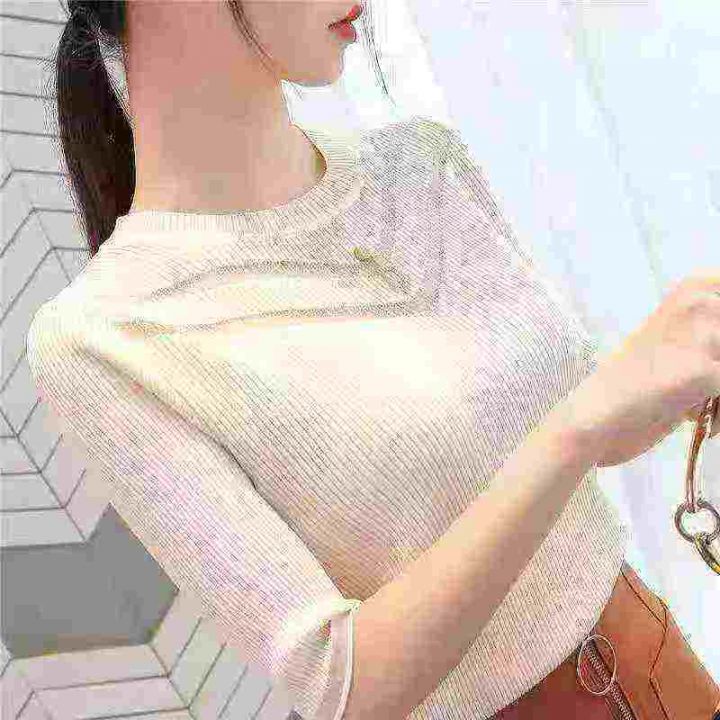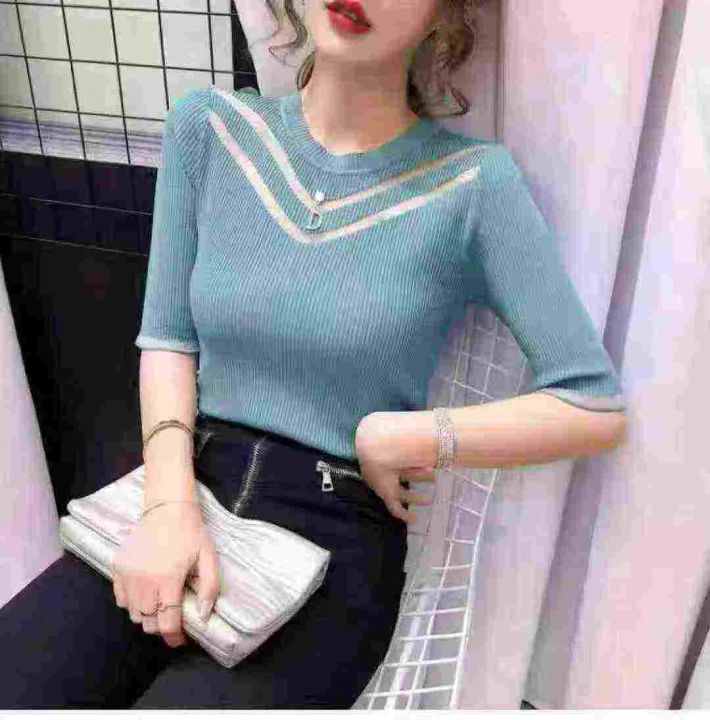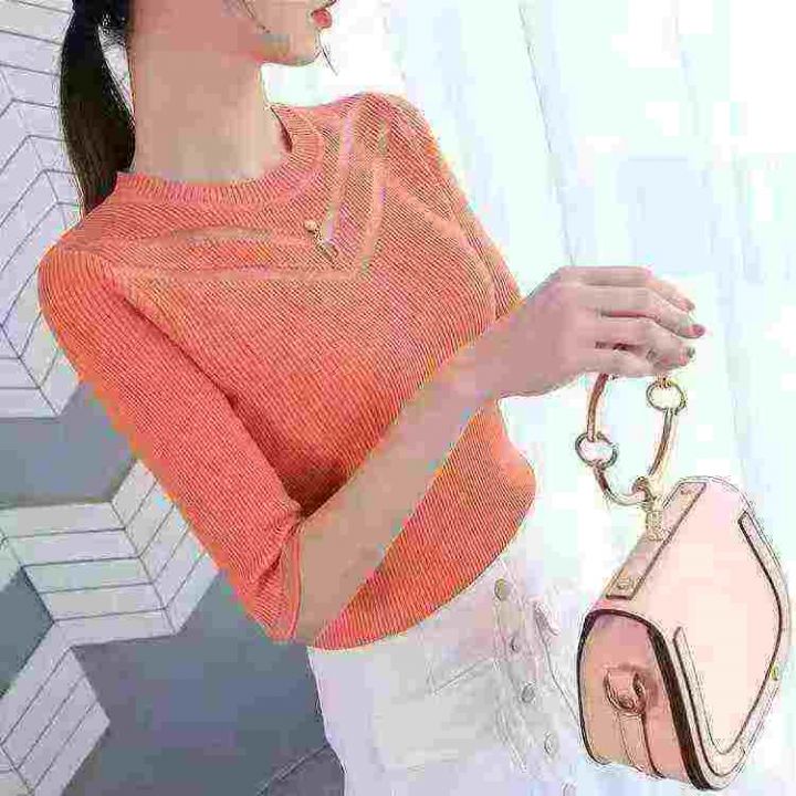 冰丝雪纺拼纱上衣圆领修身显瘦春秋中袖蕾丝镂空百搭上衣,独立包装,均码,930件,清6.8元,分货加5毛