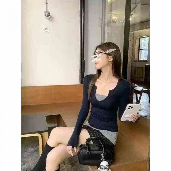 全清4.8元,6180件美式甜辣妹韩版假两件长袖t恤女春夏修身打底衫撞色纯欲显瘦上衣,独立包装,码数M-2XL,分货➕0.5