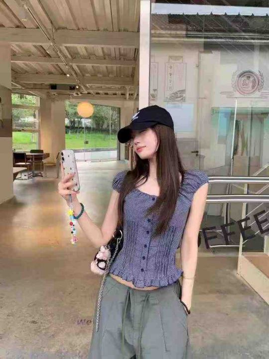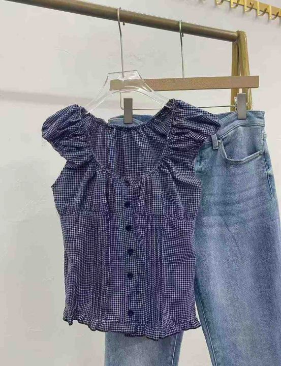 韩系复古格纹短袖衬衫187件7.9褶皱设计,荷叶边,码数...