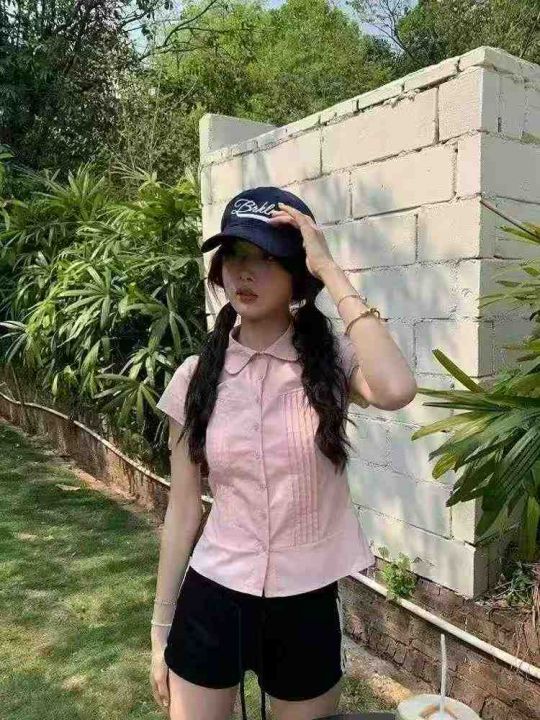 韩系甜美粉色短袖衬衫595件7.8,娃娃领,压褶设计,后...