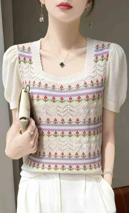 夏季新款复古碎花镂空方领法式大码正肩泡泡针织短袖小衫,独立包装,均码面料柔软舒适,377件,全清6.9元超低价秒杀!分货加一!
