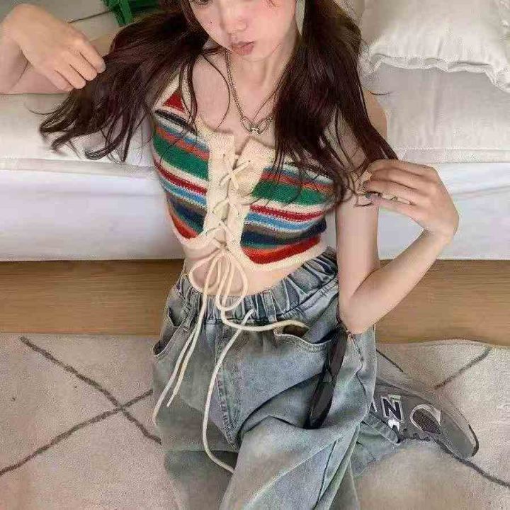 夏季新款辣妹性感纯欲风设计感抽绳绑带彩虹条纹针织吊...