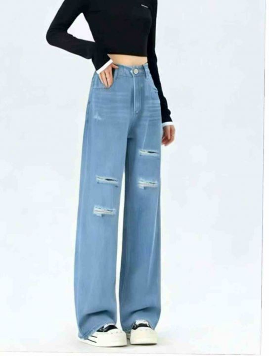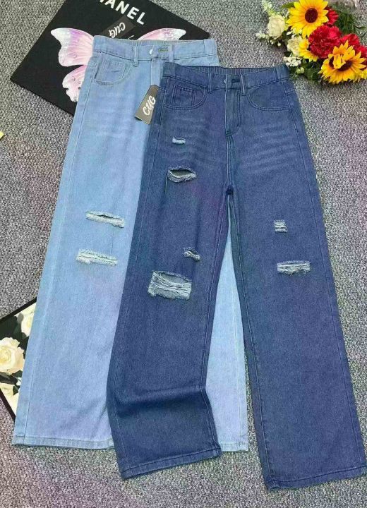 春夏季新款品牌原单宽松半松紧腰破洞设计款直筒阔腿牛...