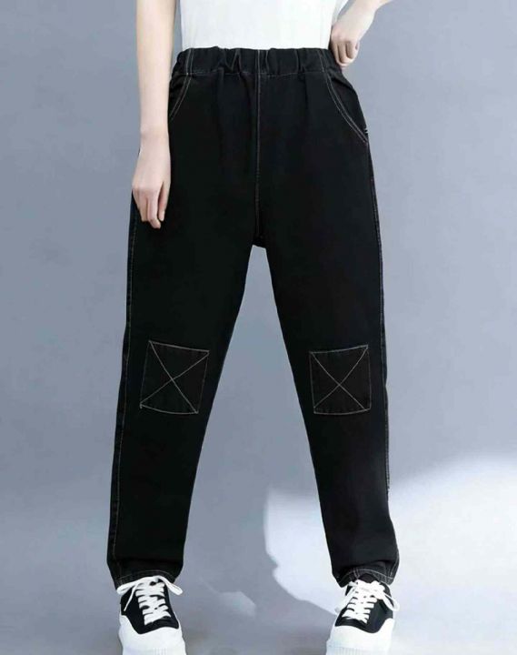 春季新款复古洗水棉高腰宽松设计款松紧腰牛仔老爹哈伦裤,独立包装,码数S-...