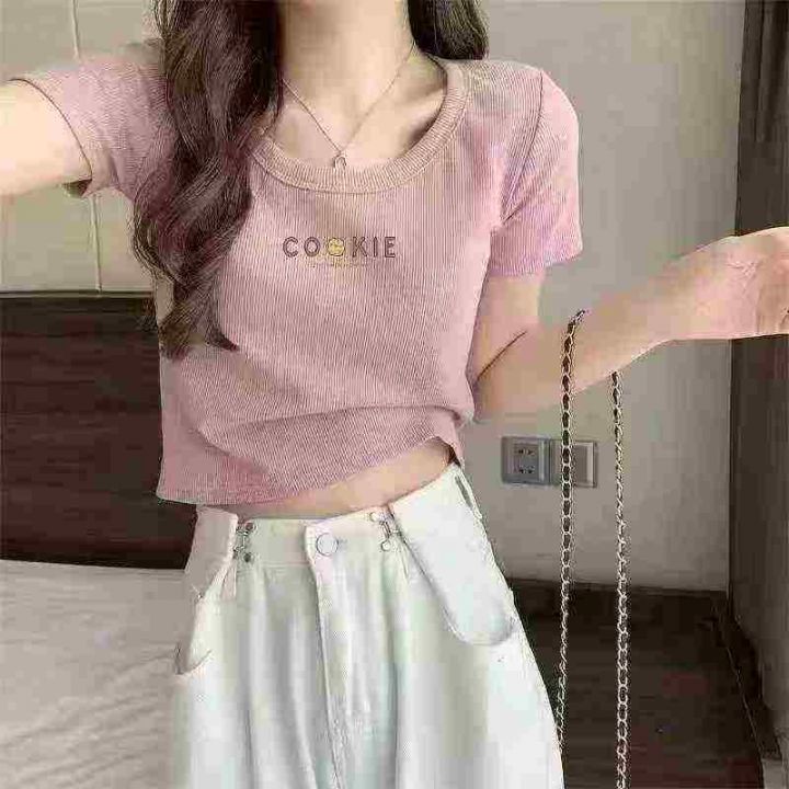 全清价6.5精梳螺纹正肩短袖T恤女甜辣风修身短款辣妹上衣,独立包装,码数2-...