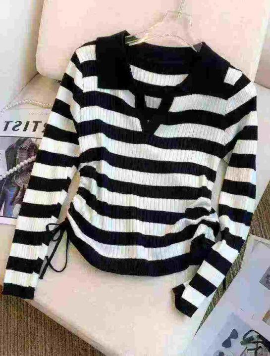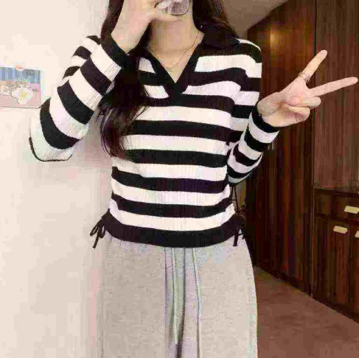 法式高级2025秋装新款韩版翻领条纹抽绳修身打底衫上衣...