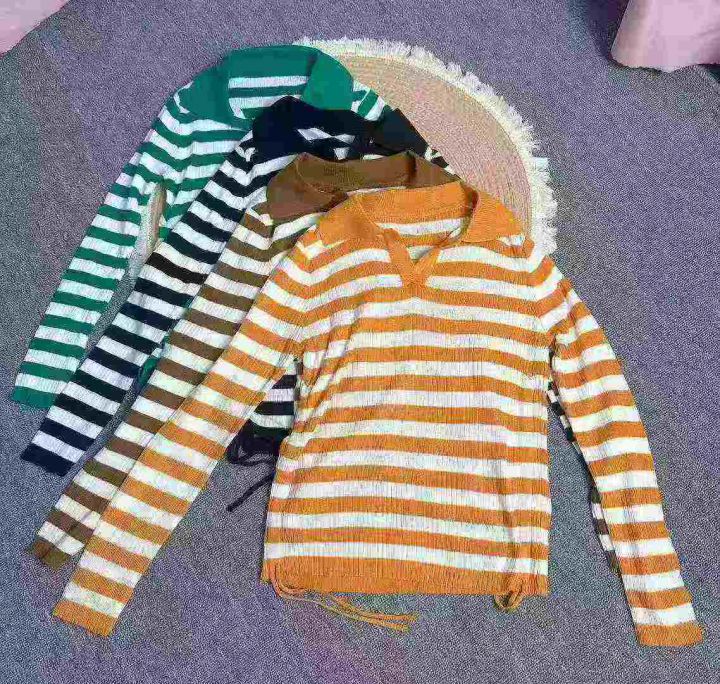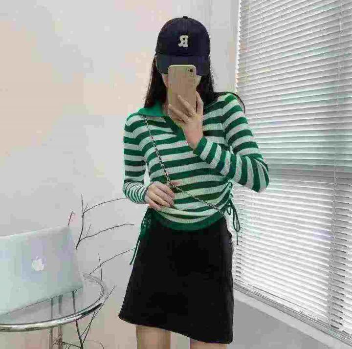 法式高级2025秋装新款韩版翻领条纹抽绳修身打底衫上衣针织衫女,六羊毛面料,独立包装,均码,660件,清8.5,分➕1