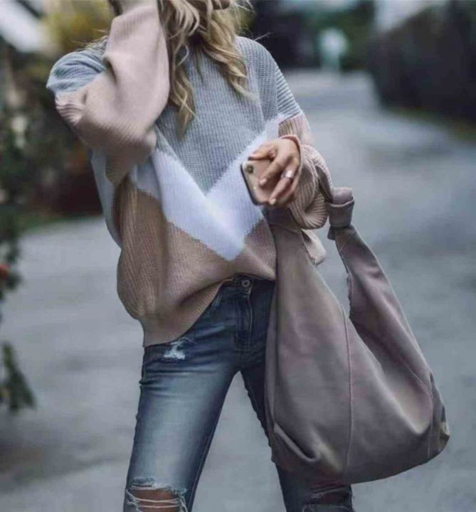 春秋新款外贸原单美式宽松慵懒风撞色设计款粗针套头毛...