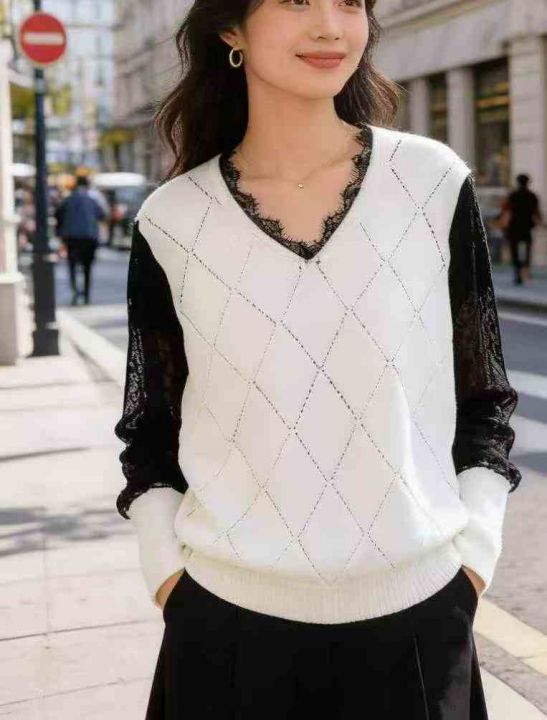 春秋新款外贸原单美式宽松慵懒风拼接设计款粗针套头毛...