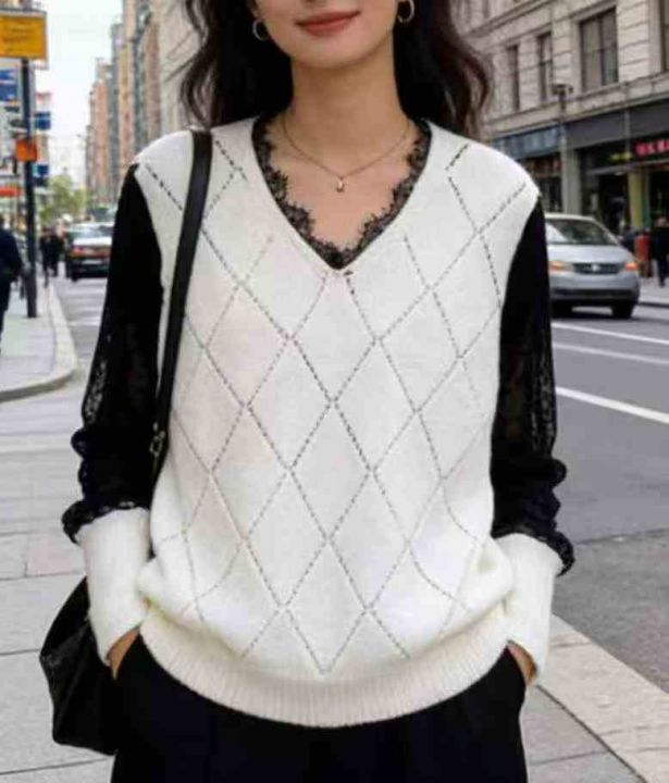 春秋新款外贸原单美式宽松慵懒风拼接设计款粗针套头毛...
