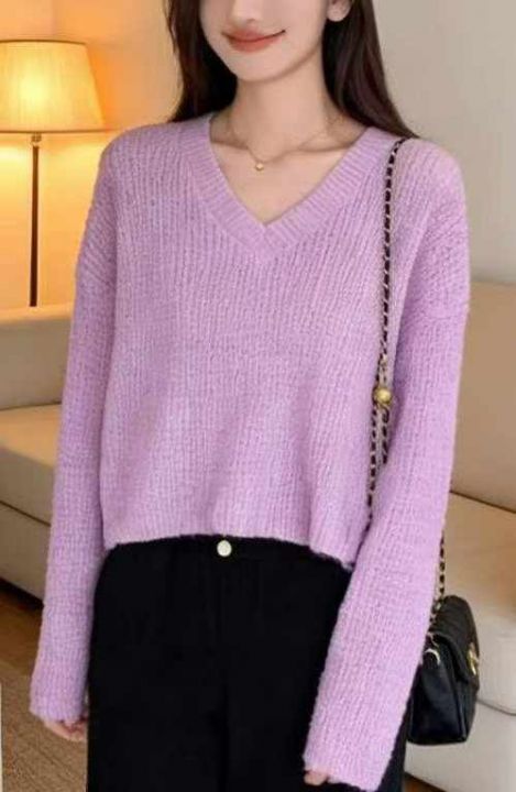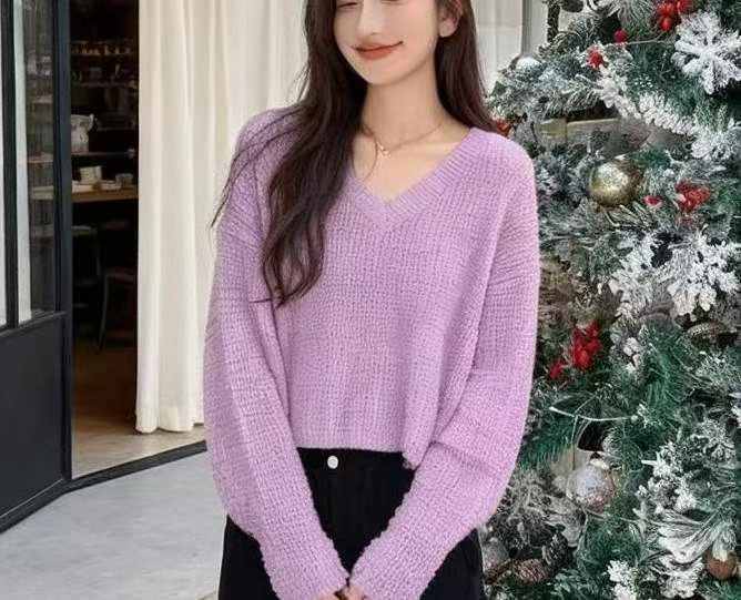 春秋新款短款宽松慵懒风V领套头毛衣,独立包装, 码数S...
