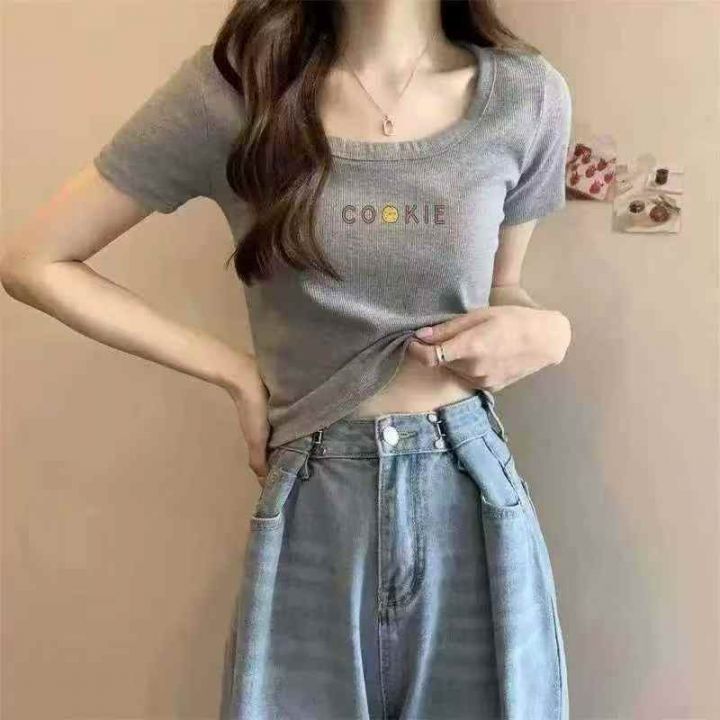 328件复古ins夏季正肩短袖t恤女修身显瘦辣妹短款法式别致开叉V领上衣,面料...