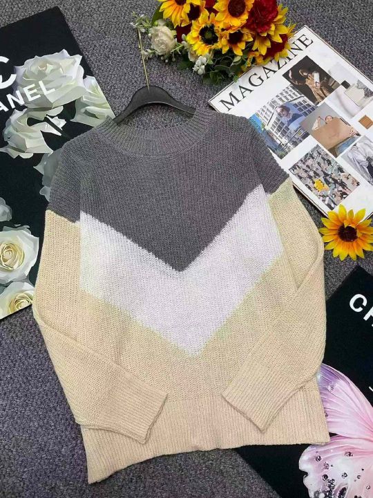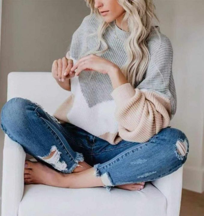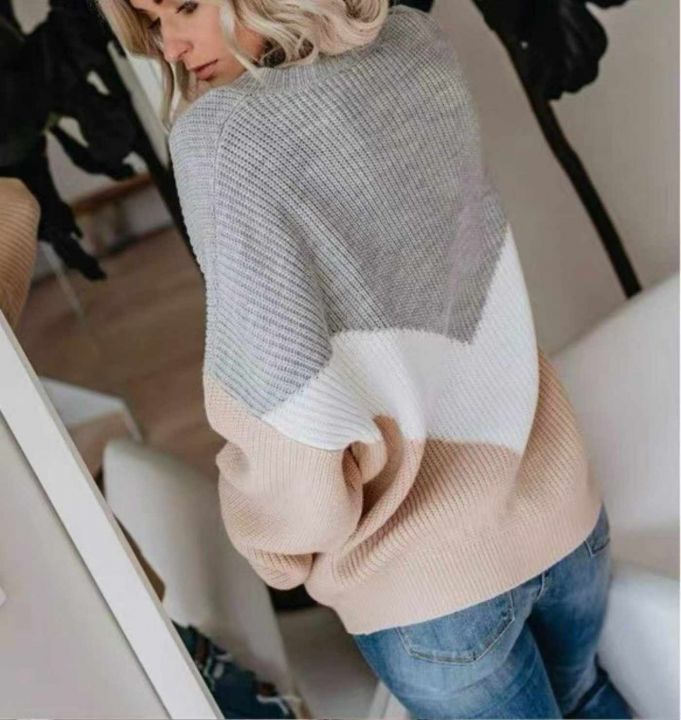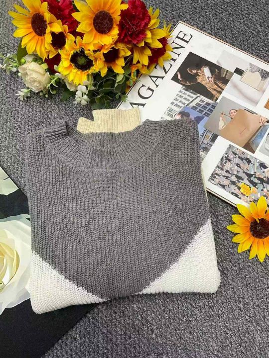 春秋新款外贸原单美式宽松慵懒风撞色设计款粗针套头毛...
