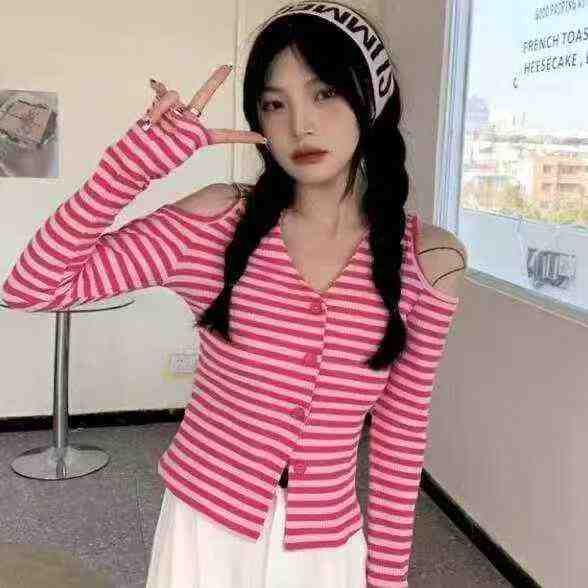 春夏季新款纯欲风V领露肩小心机设计感条纹显瘦针织开衫,独立包装,均码面...