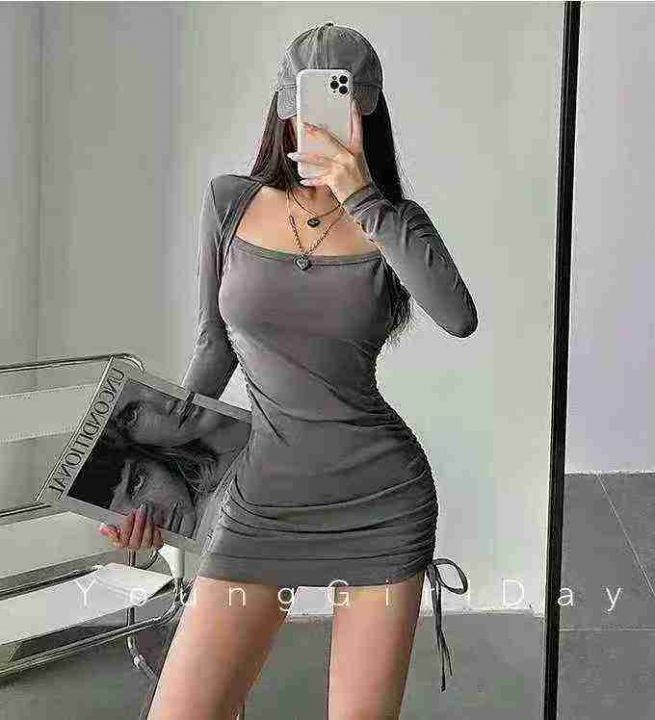 性感修身包肩长袖连衣裙60件7.9,露锁骨,抽绳褶皱,码数S-M-XL-2XL,独立...