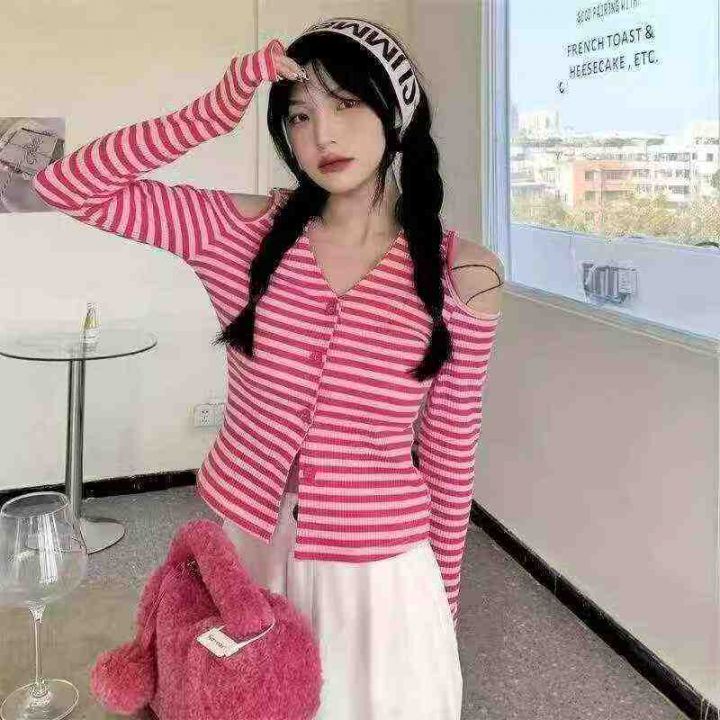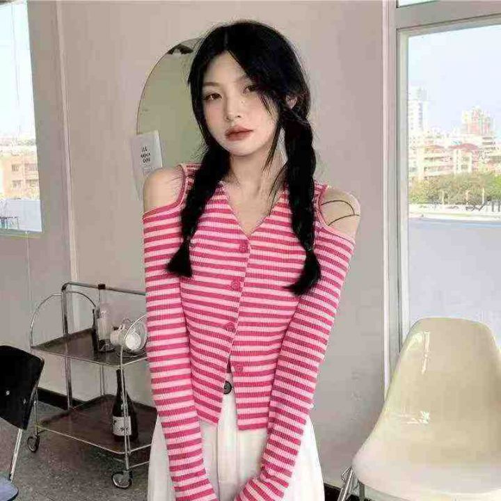 春夏季新款纯欲风V领露肩小心机设计感条纹显瘦针织开...