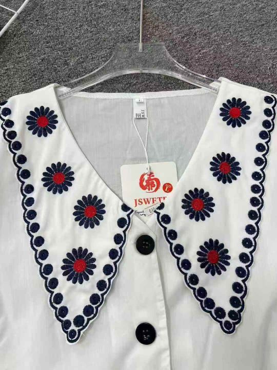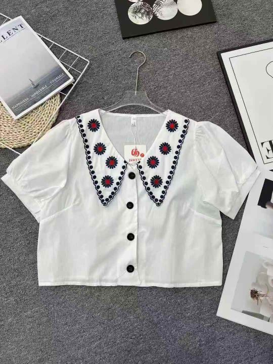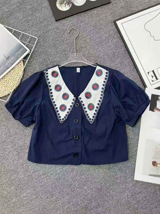 ☕️法式设计感绣花娃娃领泡泡袖小众宽松短袖衬衫女18...