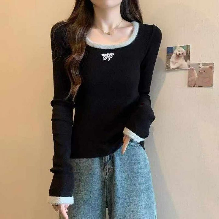 早秋新款小香风撞色刺绣减龄百搭拼接水貂毛设计款套头...