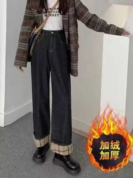秋冬复古加绒加厚宽松显瘦牛仔裤女大码胖mm高腰直筒翻边阔腿长裤180件,独...