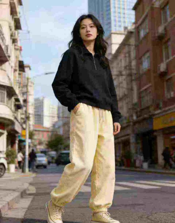 灯芯绒裤子女春秋冬季加绒阔腿高腰显瘦休闲抽绳运动裤...