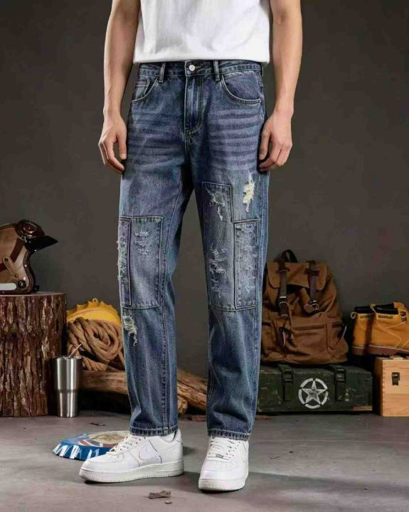 春季新款高端美式个性拼接男款宽松复古蓝色刮烂设计款牛仔裤,独立包装带吊...