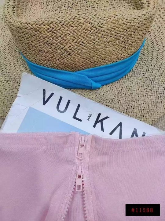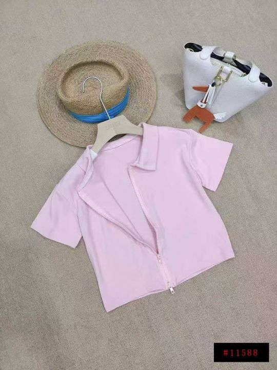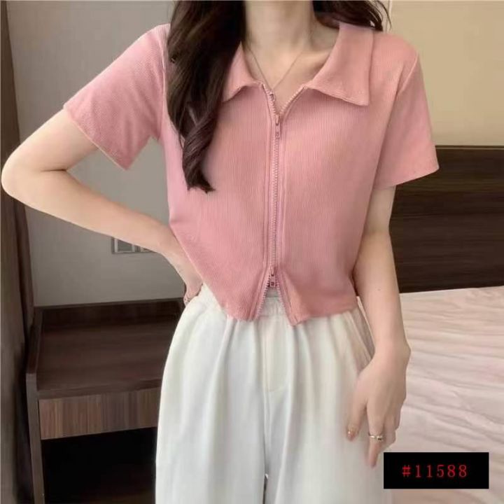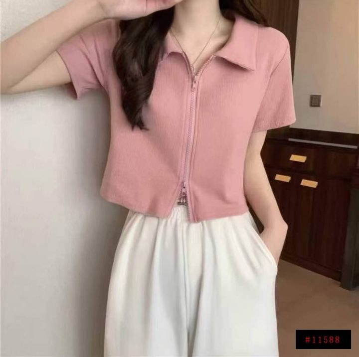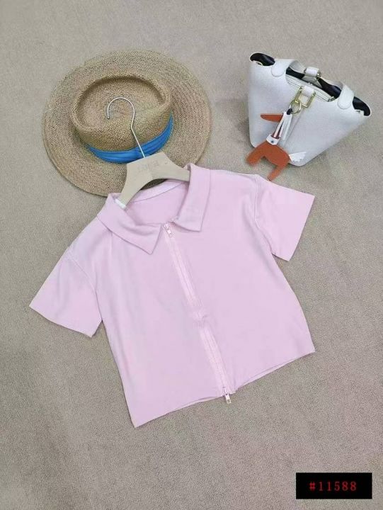 [月亮]:粉色Polo领双拉链短袖辣妹棉质上衣