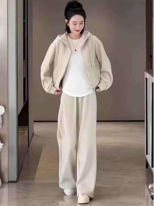 春秋新款穿搭时髦遮肉显瘦慵懒风休闲套装卫衣运动裤两件套,两个图片款,不同区别在于袖口设计不一样,自行配套