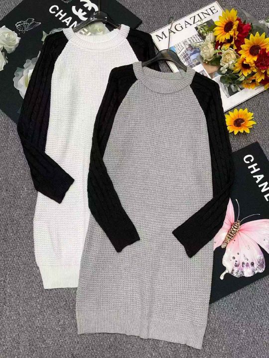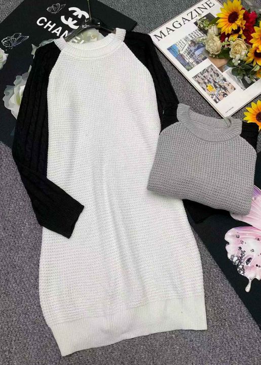 秋冬新款撞色插肩袖宽松慵懒风中长款毛衣,独立包装,...