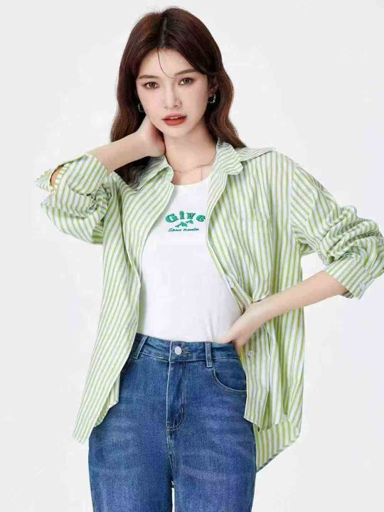 全清价7.8女竖条纹减龄韩系宽松气质显瘦衬衫,独立包...