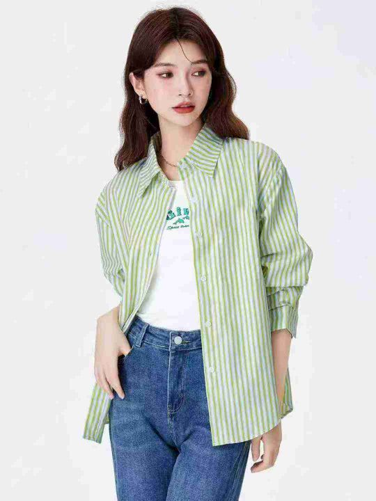 全清价7.8女竖条纹减龄韩系宽松气质显瘦衬衫,独立包...