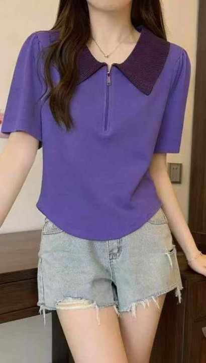 夏季新款韩系正肩POLO领撞色设计感拉链显瘦针织T桖,...