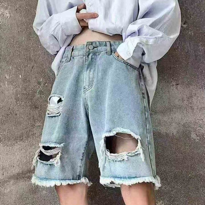 夏季新款男女同款破洞设计款阔腿牛仔短裤,独立包装,...
