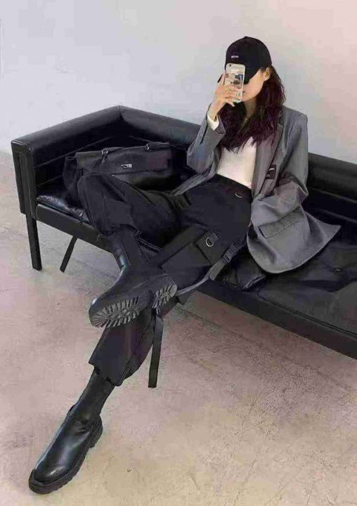 春秋新款弹力复古多袋工装松紧腰休闲裤,独立包装带吊...
