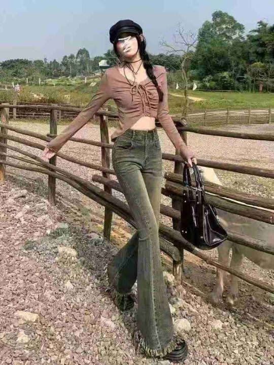 新款微喇叭流苏牛仔裤女春秋弹力修身高腰显瘦修身马蹄长裤110件,独立包装...