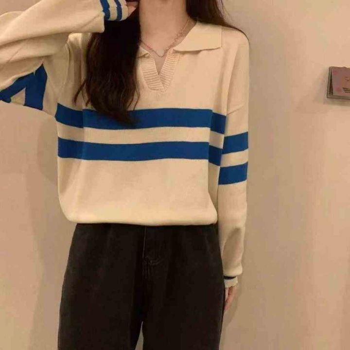 捡漏款,春秋新款女装撞色条纹减龄复古polo领长袖针织衫,独立包装,均码年...