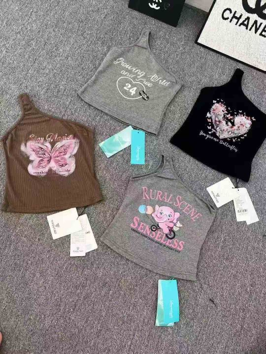 230件品牌甜辣风斜肩背心,小整款,多款多色图案多,均码,面料螺纹棉跟纯棉。(模特图仅供参考上身效果)