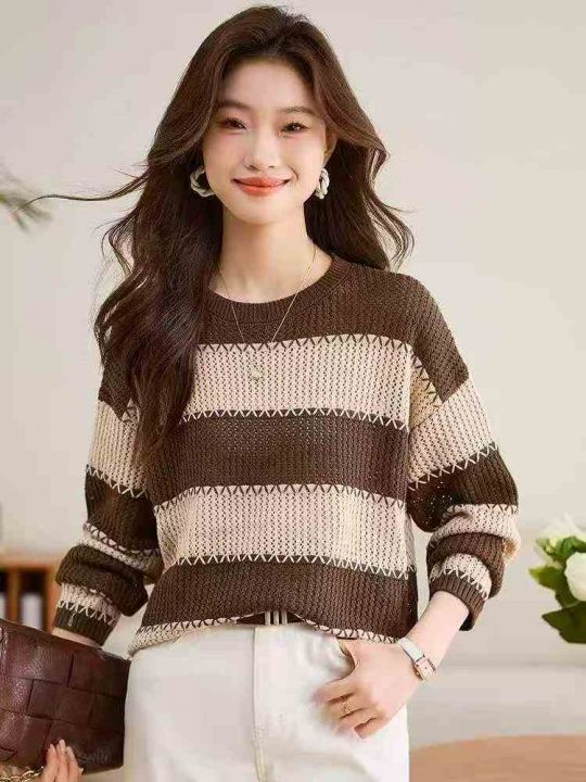 春秋新款韩系宽松撞色条纹慵懒风圆领套头毛衣,独立包...
